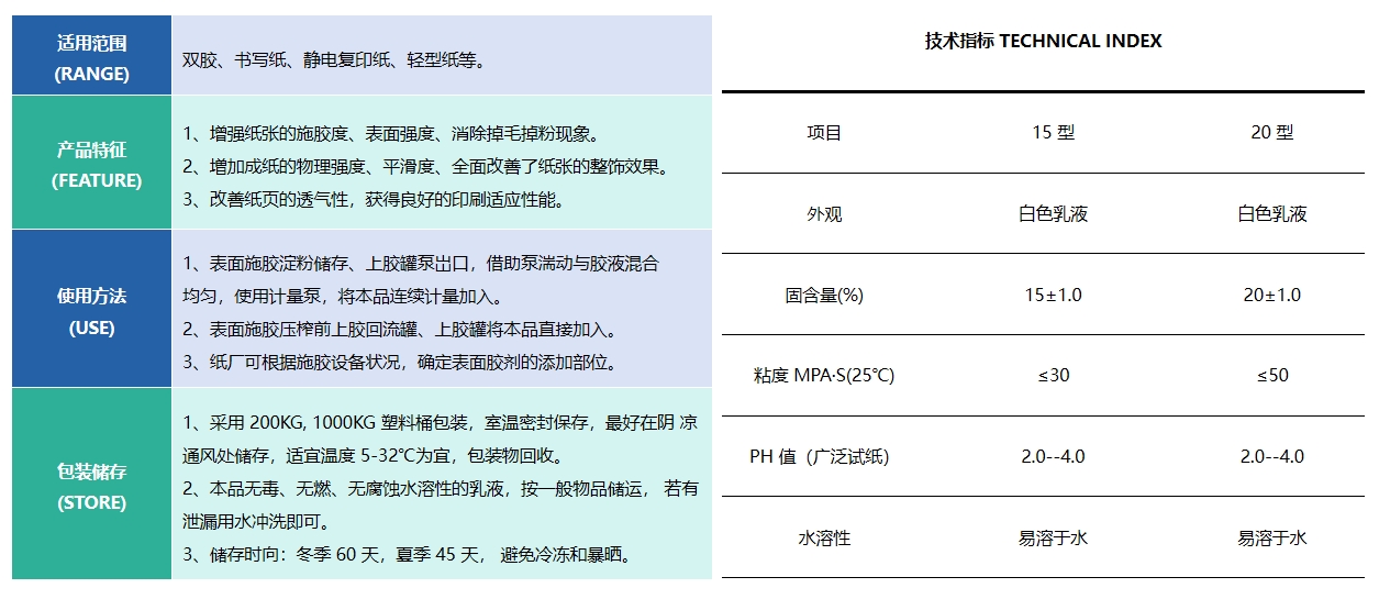 HQ-N9113 表面施校劑,是一種陽離子高分子聚合物,其分子結構中含有多功能活性基團與纖維有較強的結合能力。該產品使用進口高分子材料,采用特殊工藝,使其更微粒化、納米化,能較強的滲透紙頁內部與淀粉膠共同作用,起到施膠和增加表面強度作用。